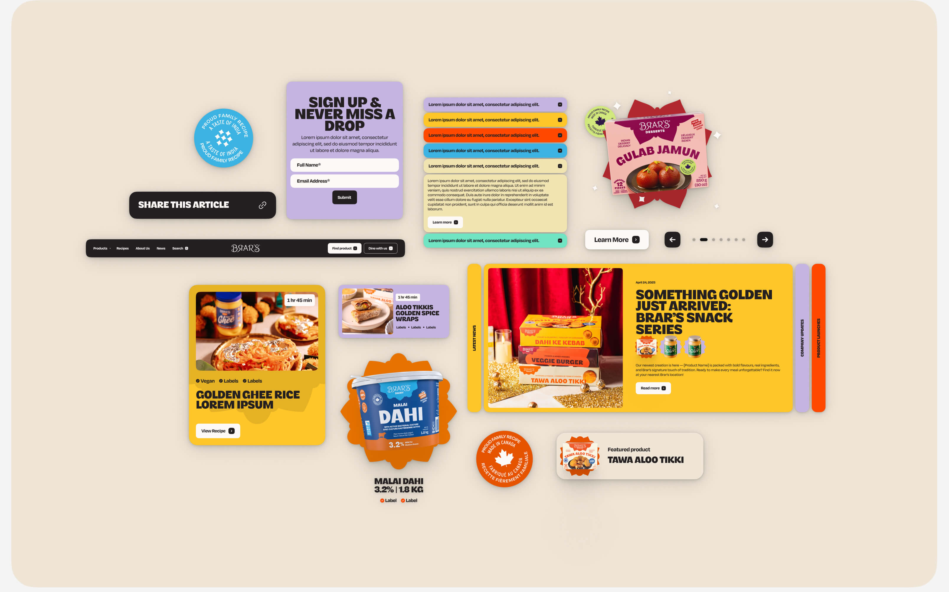 As part of the Brar’s brand refresh, we redesigned the retail website to reflect the warmth and richness of Indian culinary traditions. Warm, earthy tones like deep reds, oranges, and gold accents were paired with bold typography to create a vibrant, inviting experience that feels both authentic and premium. The updated design highlights Brar’s distinctive product packaging and incorporates soft, rounded corners to give the site a more playful, approachable feel.