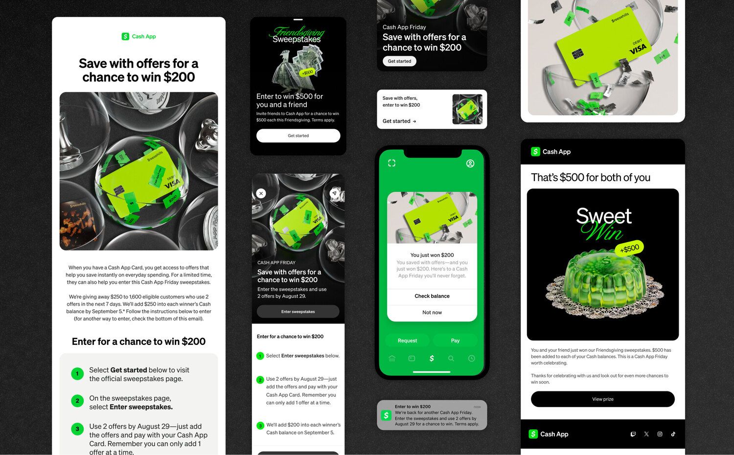 With every giveaway campaign, there’s a high volume of emails and app pushes designed to build momentum and drive engagement. Our team supports Cash App by crafting those communications—structuring the content, designing the layouts, and ensuring the visuals are clear, compelling, and aligned with the campaign narrative.