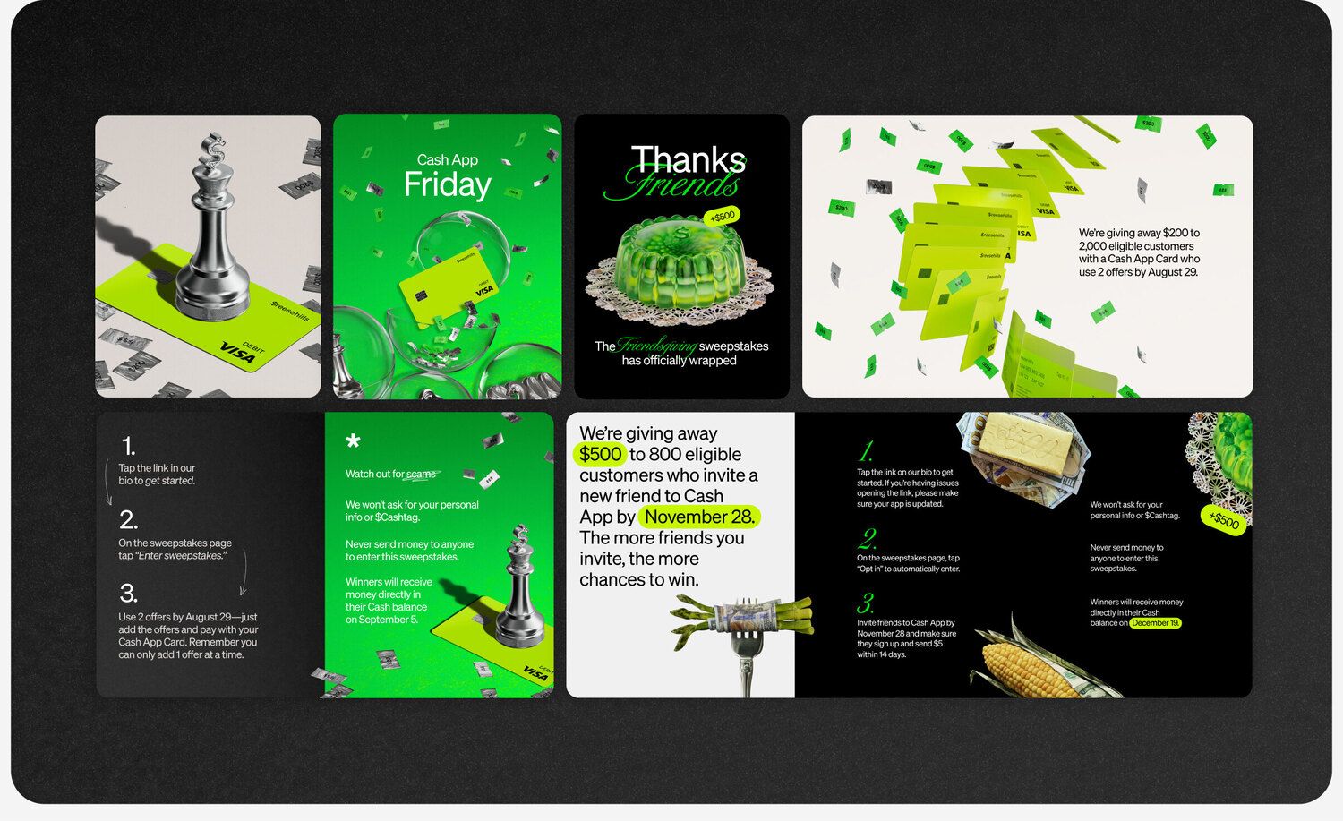 To fuel excitement around each campaign, we create all social-facing imagery—including Instagram posts, carousels, and reels. We ensure every asset reflects the Cash App brand while introducing fresh visual energy that builds hype and drives engagement.