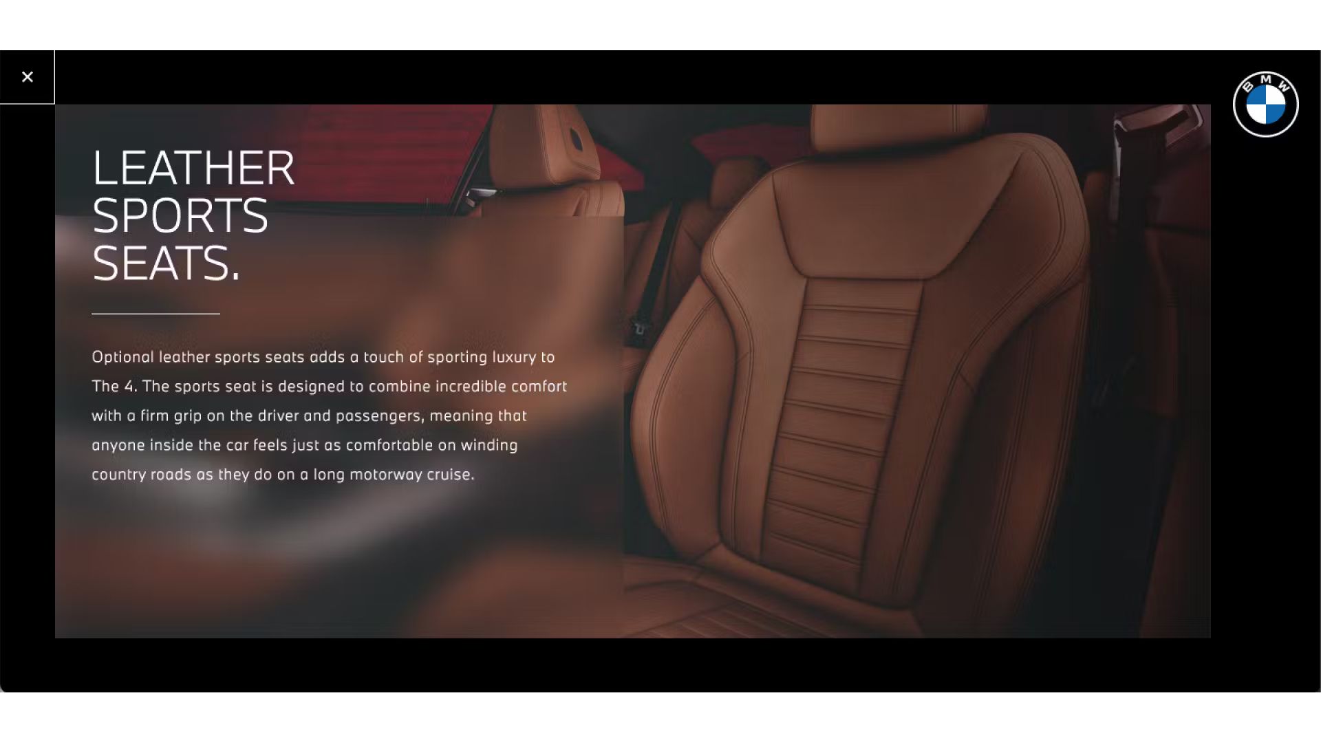 The microsite contained multiple hotspots, allowing the user to look around and interact with the interior of the car. Vue.js and SCSS made up the base for our experience. We integrated Marzipano’s 360 Media Viewer and leveraged their custom hotspot support to tailor the experience to our liking. Sleek and modern animations were implemented with a combination of GSAP and native CSS animations to capture the expressive design and incomparable dynamics of the 4 Series.
